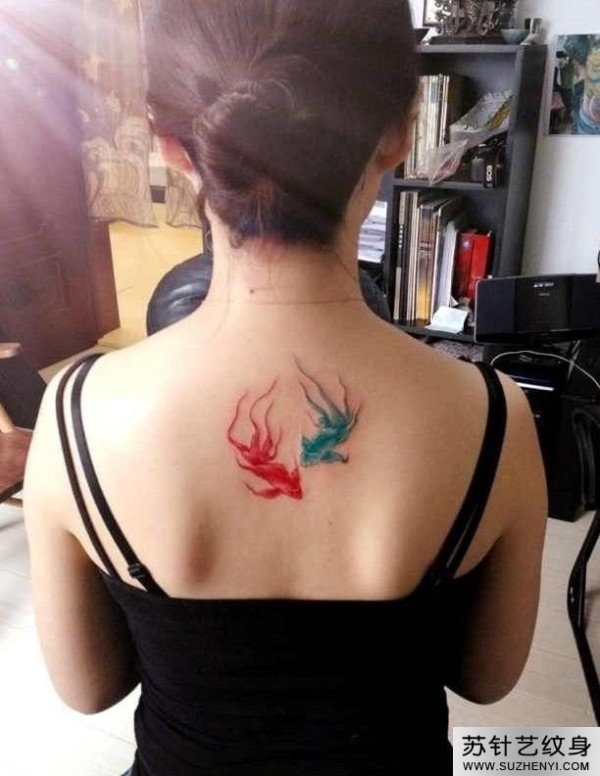 女生背上唯美漂亮红蓝情侣鱼纹身_情侣纹身图案大全_纹身图吧