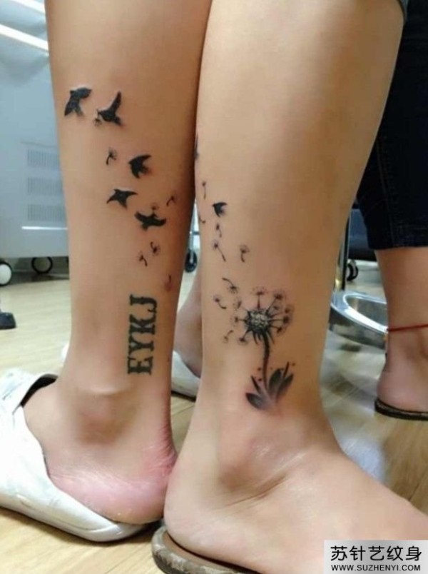 蒲公英与鸟儿字母图腾情侣纹身_情侣纹身图案大全_纹身图吧