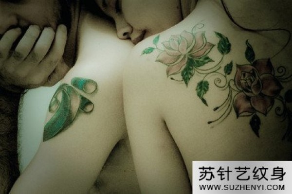 情侣肩部唯美彩色花藤纹身_情侣纹身图案大全_纹身图吧