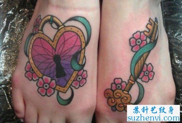 脚部情侣爱心锁与钥匙纹身图案_情侣纹身图案大全_纹身图吧