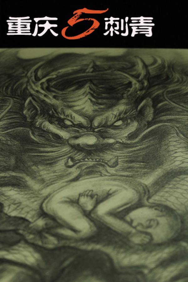 一组满背大气九龙拉棺纹身图案作品和手稿