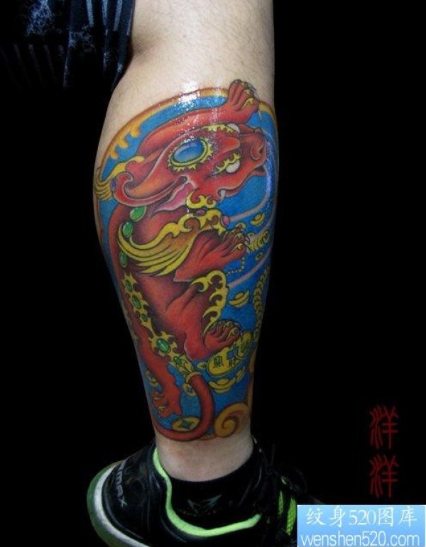腿部好看漂亮的彩色招财神兽貔貅纹身图片_麒麟纹身图案大全_纹身图吧