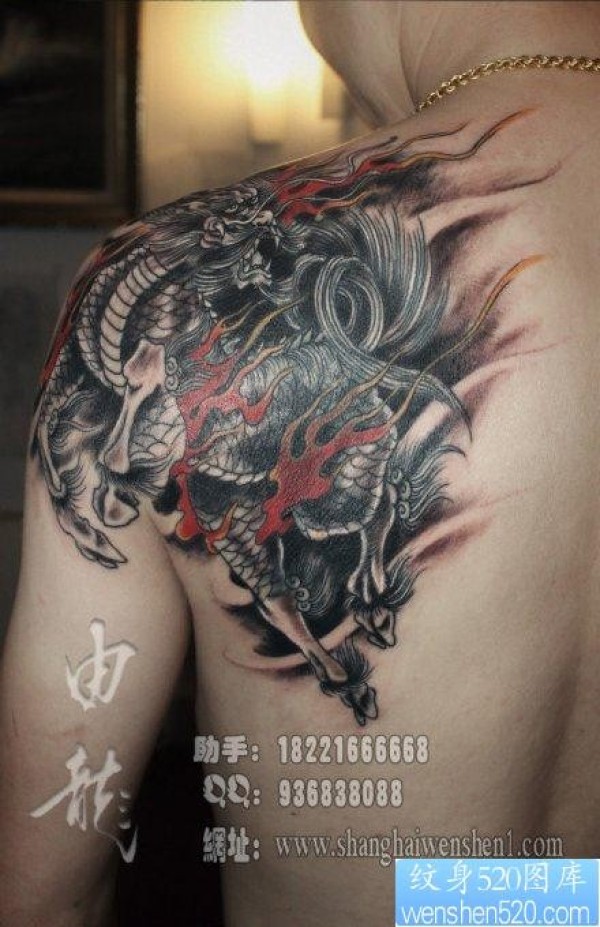 男性后肩背霸气经典的麒麟纹身图片_麒麟纹身图案大全_纹身图吧