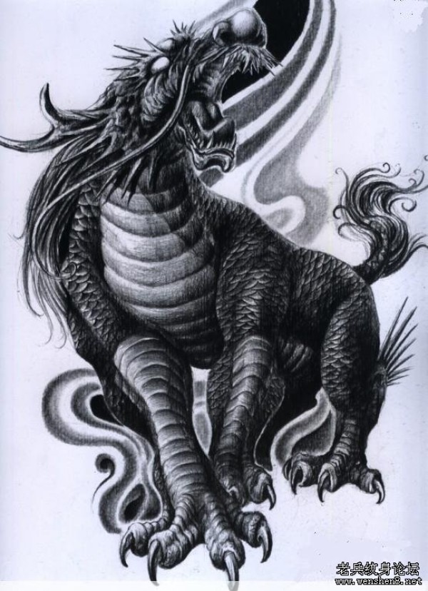 龙纹身手稿_一组老传统黑灰龙手稿纹身图案