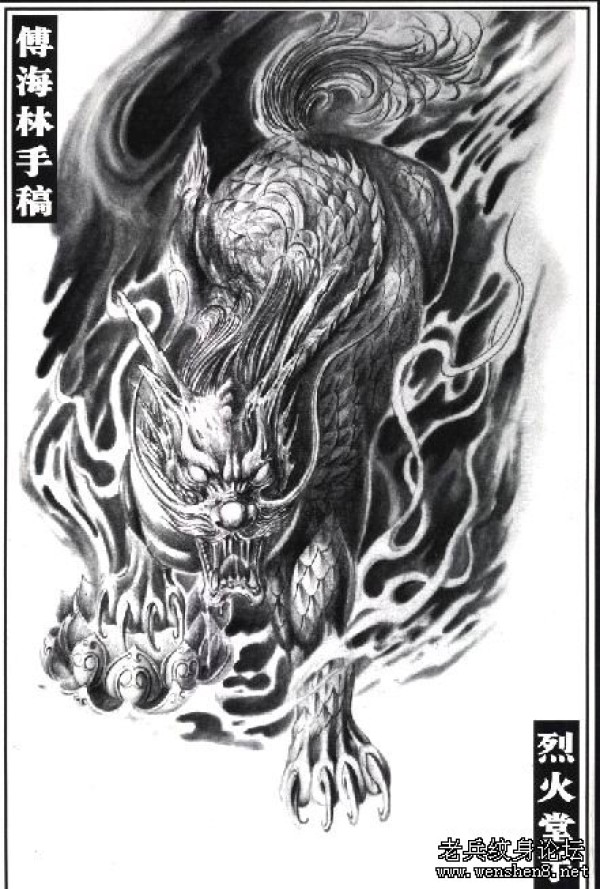 龙纹身手稿_一组老传统黑灰龙手稿纹身图案