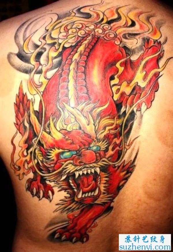 背部霸气的火麒麟纹身图片_麒麟纹身图案大全_纹身图吧