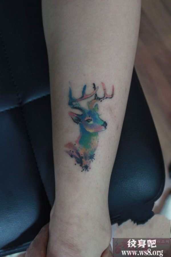 手腕炫彩麋鹿头像纹身图案_手臂纹身图案大全_纹身图吧