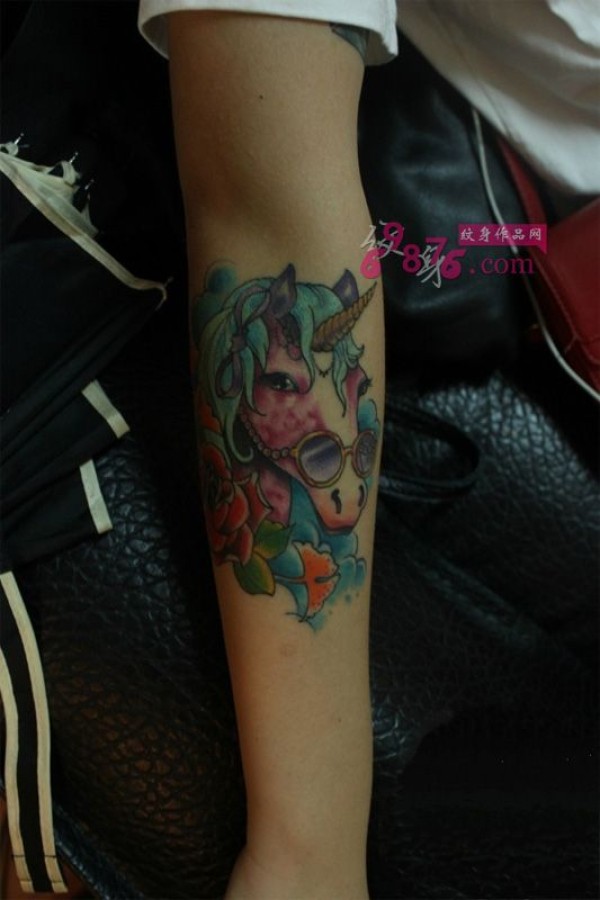 个性戴眼镜独角兽纹身_手臂纹身图案大全_纹身图吧