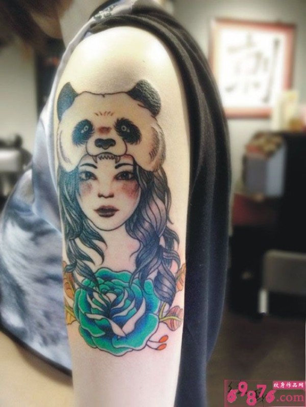 创意熊猫女花臂纹身_手臂纹身图案大全_纹身图吧