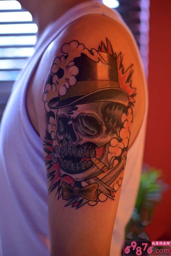 个性抽烟骷髅花臂纹身_手臂纹身图案大全_纹身图吧