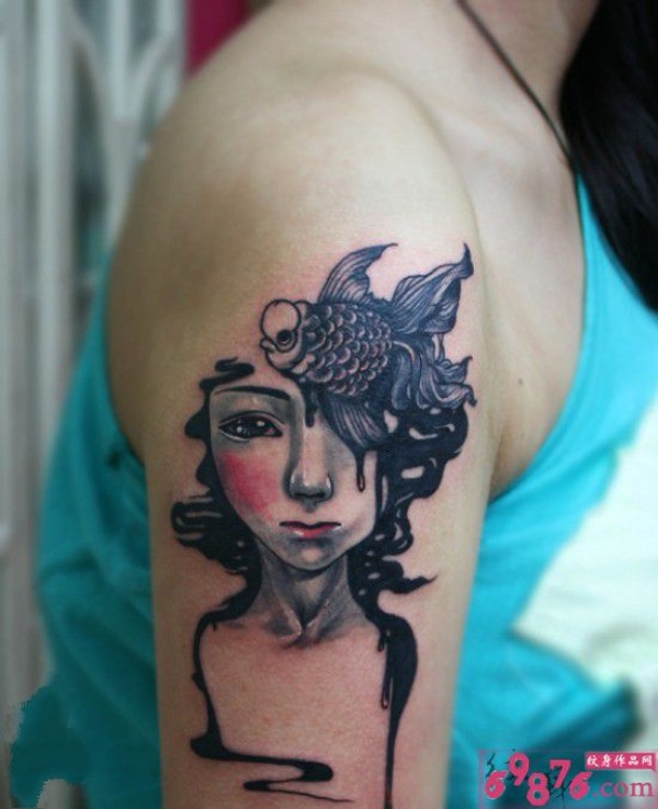 艺术风美女与鱼手臂纹身_手臂纹身图案大全_纹身图吧