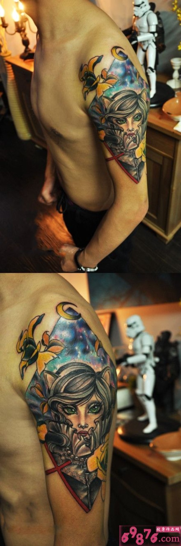 创意星空猫女花臂纹身_手臂纹身图案大全_纹身图吧