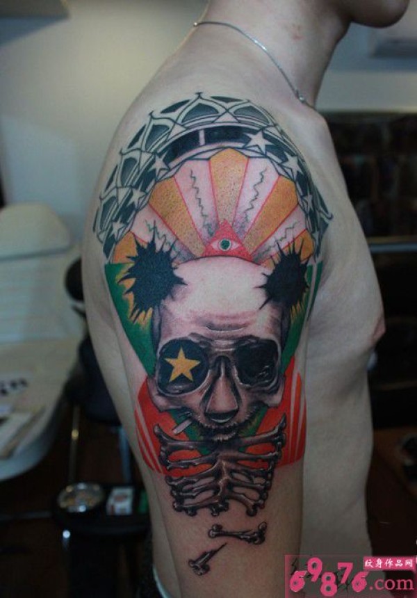 创意熊猫骷髅花臂彩色纹身_手臂纹身图案大全_纹身图吧