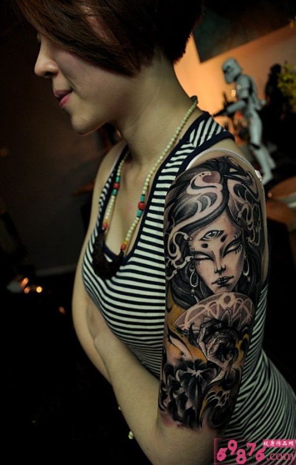 艺妓蛇与花创意霸气手臂纹身_手臂纹身图案大全_纹身图吧