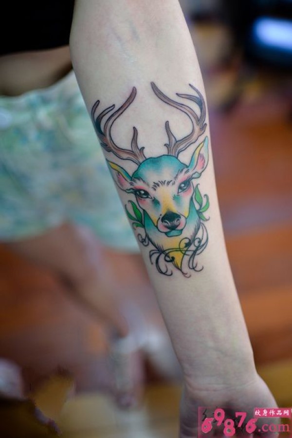 小臂内侧彩绘鹿头纹身_手臂纹身图案大全_纹身图吧