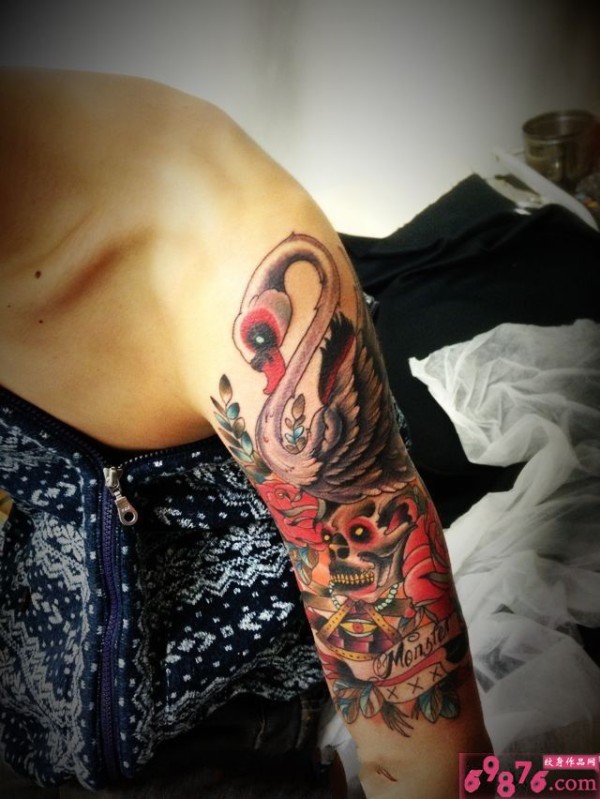 天鹅骷髅花臂个性纹身_手臂纹身图案大全_纹身图吧