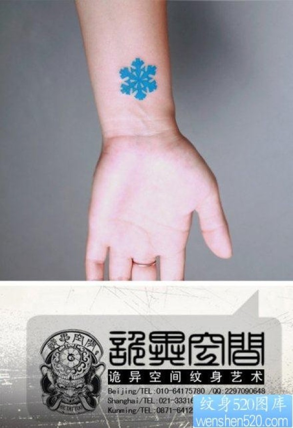 女人手腕时尚简单的蓝色雪花纹身图片_手臂纹身图案大全_纹身图吧