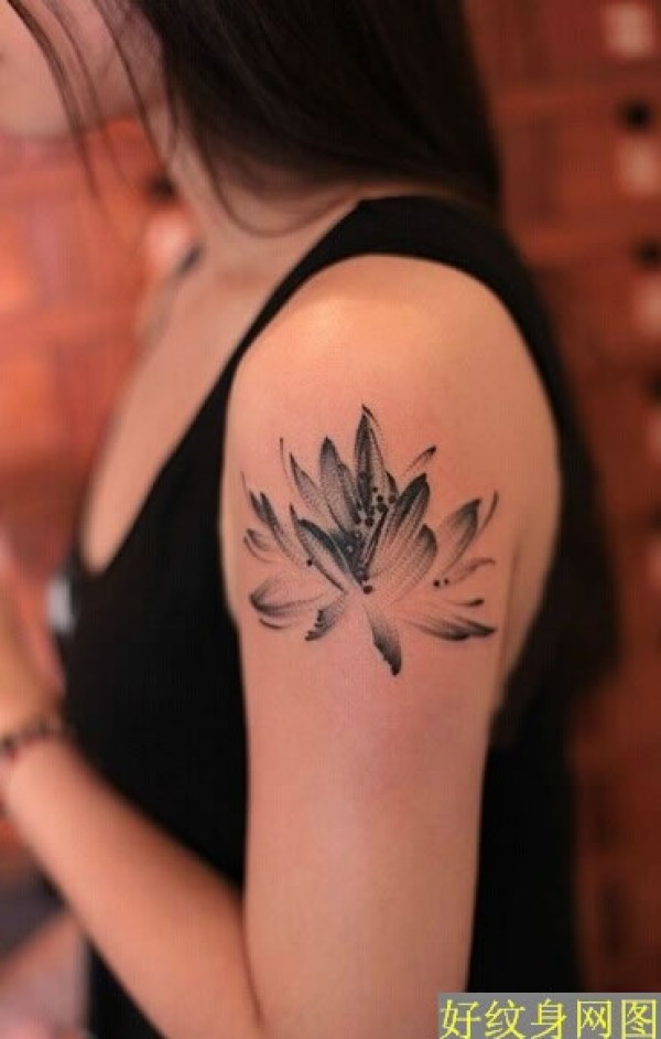 大臂上中国元素水墨花朵纹身淡色的荷花纹身图_手臂纹身图案大全_纹身图吧