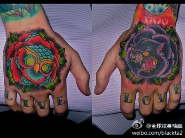 手背很酷帅气的猫头鹰与豹头纹身图案_手臂纹身图案大全_纹身图吧