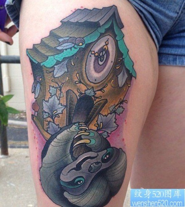 腿部彩色school风格纹身图片_school纹身图案大全_纹身图吧