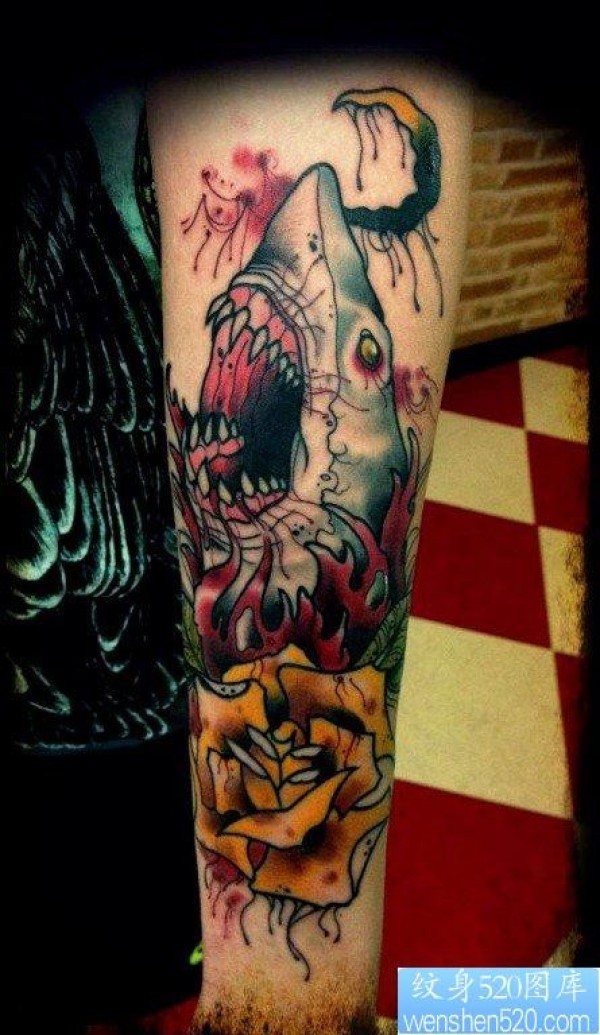 小臂上一张school风格鲨鱼纹身图案_school纹身图案大全_纹身图吧