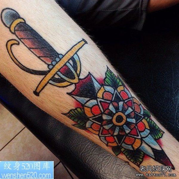 school风格彩色花匕首纹身作品_school纹身图案大全_纹身图吧