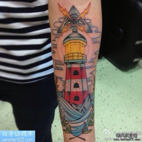 手臂school彩色燈塔纹身作品_school纹身图案大全_纹身图吧