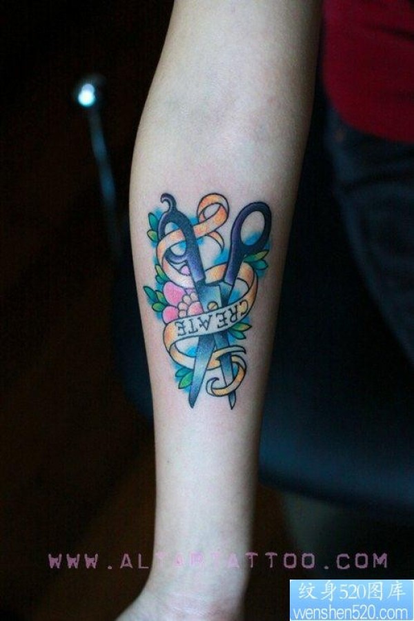 女人手臂潮流的new school剪刀纹身图片_school纹身图案大全_纹身图吧