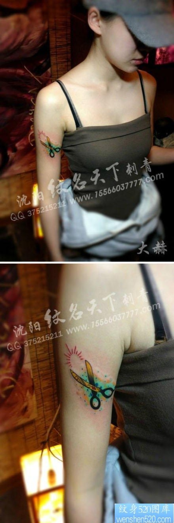 女人手臂潮流精美的new school剪刀纹身图片_school纹身图案大全_纹身图吧