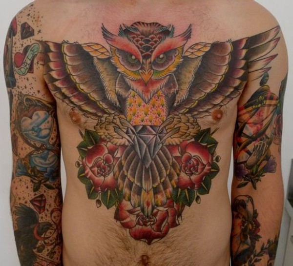 男人前胸超酷的old school猫头鹰纹身图案_school纹身图案大全_纹身图吧