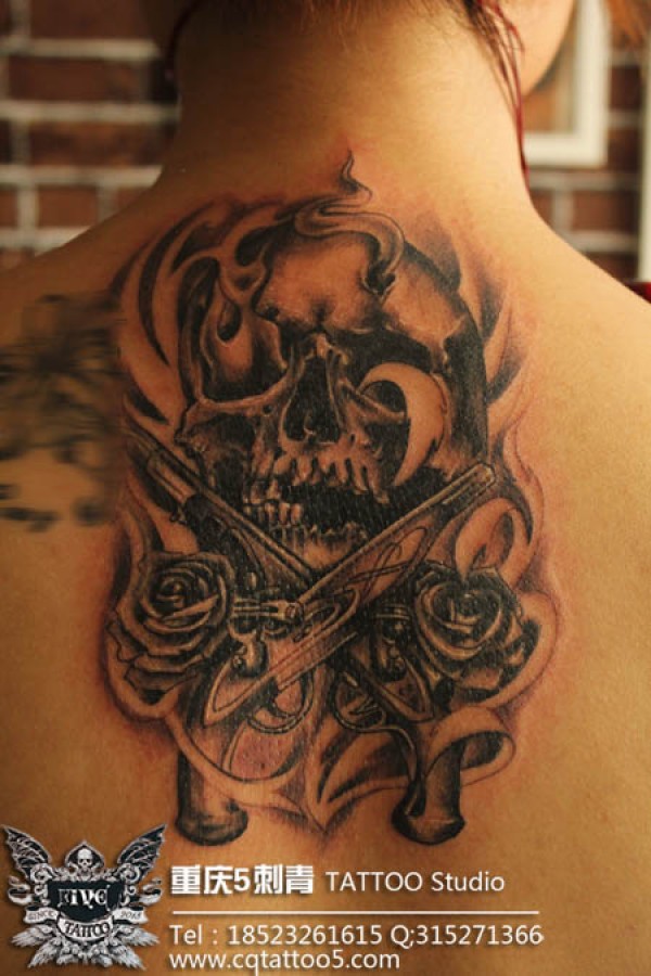 重庆5刺青 new school风格 枪花骷髅组合_school纹身图案大全_纹身图吧