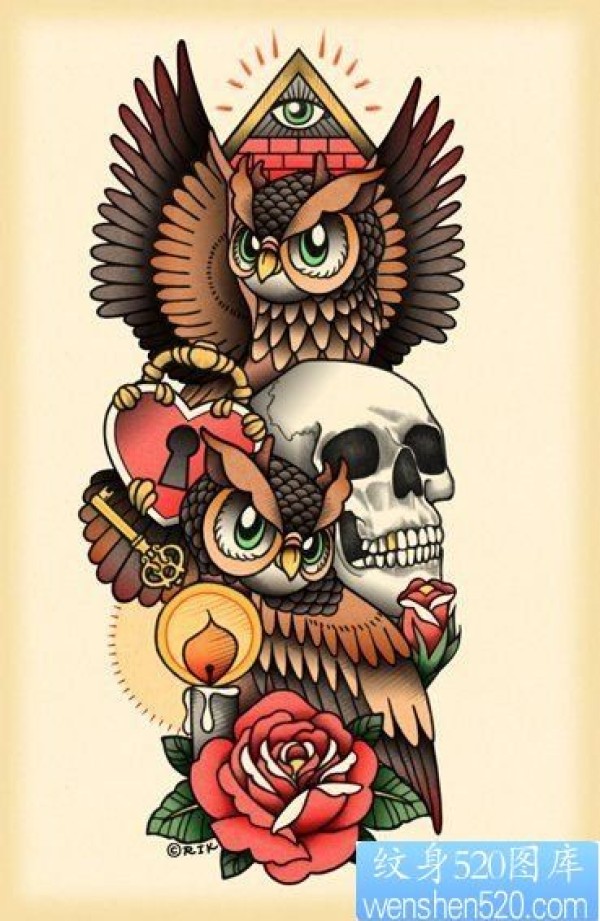 骷髅头上帝之眼猫头鹰纹身手稿图案_上帝之眼图案大全_纹身图吧