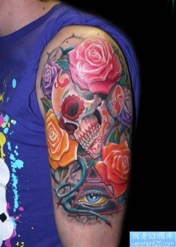 手臂彩色骷髅玫瑰上帝之眼纹身图案_上帝之眼图案大全_纹身图吧
