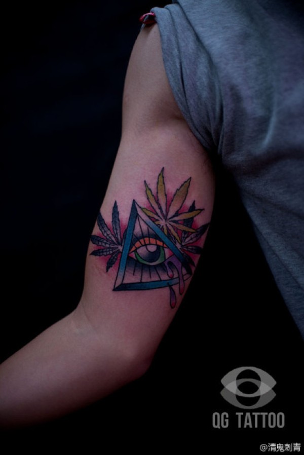 男生手臂时尚经典的一款上帝之眼与大麻叶纹身_上帝之眼图案大全_纹身图吧
