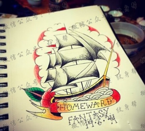 一款帆船纹身手稿图案