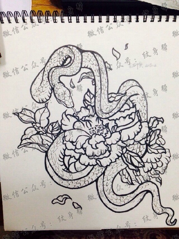 一组12张蟒蛇牡丹纹身手稿素材图案