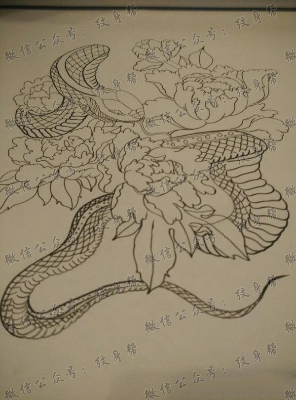 一组12张蟒蛇牡丹纹身手稿素材图案