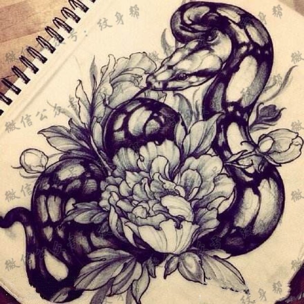 一组12张蟒蛇牡丹纹身手稿素材图案