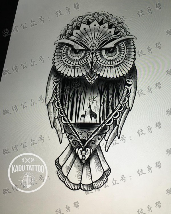 一组漂亮的猫头鹰纹身手稿素材图案