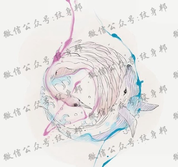 彩色天鹅+鲸鱼组成几何圆形纹身手稿