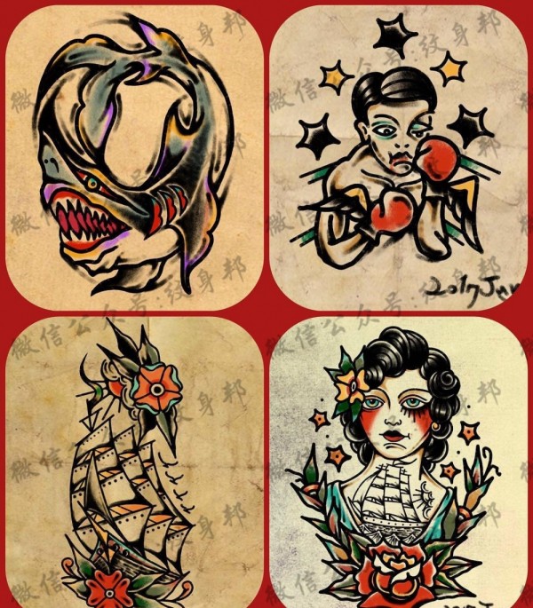 彩色人物肖像+帆船+鲨鱼纹身手稿