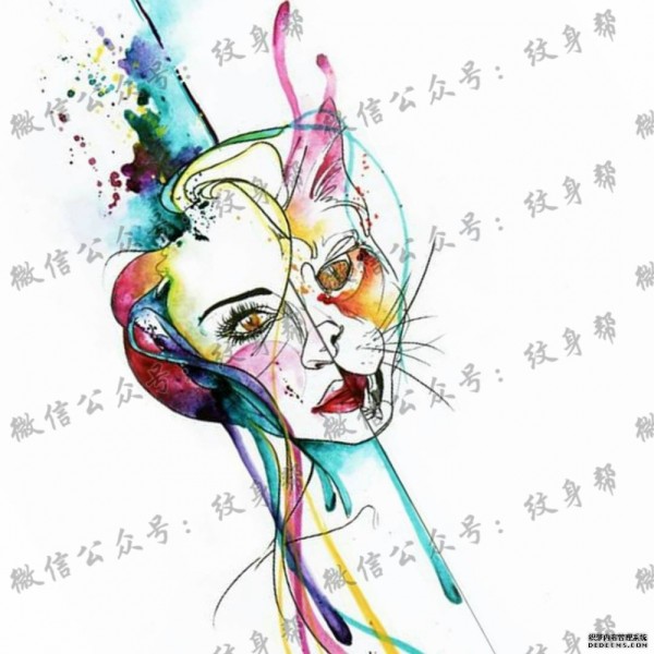 一张彩色人脸肖像+猫咪抽象纹身手稿