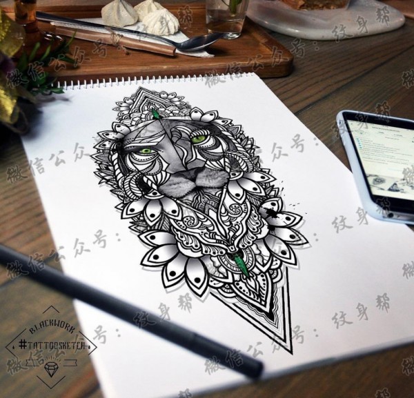 半甲唐狮手稿 传统的9款唐狮主题半甲纹身手稿图片