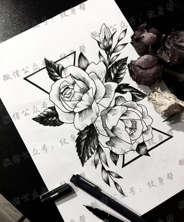 黑灰花几何叶子纹身手稿
