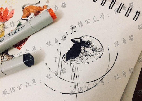 黑灰小鸟线条纹身手稿