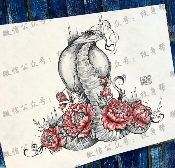 色彩蛇牡丹文身手稿