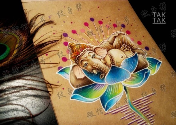 色彩象神莲花纹身手稿