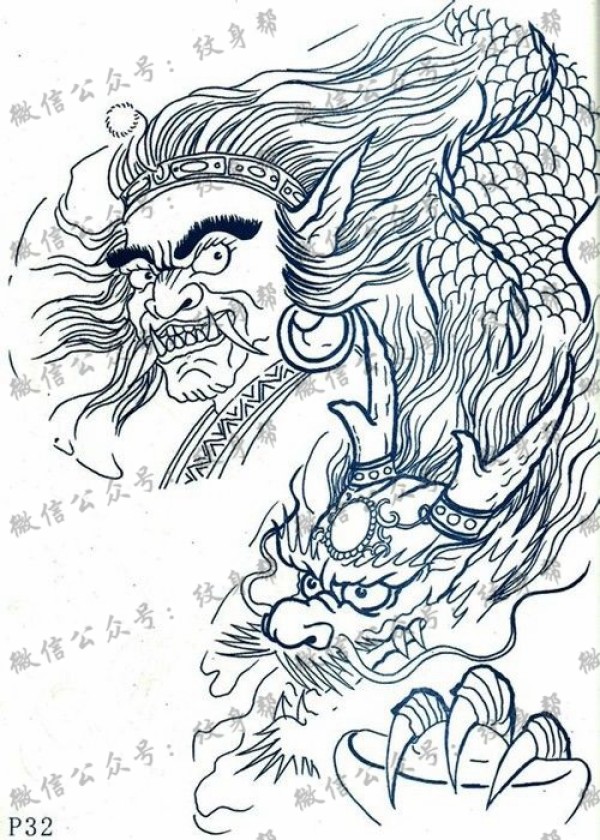 半甲唐狮手稿 传统的9款唐狮主题半甲纹身手稿图片