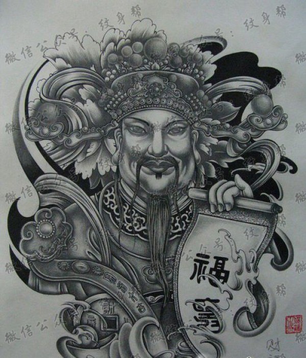 中国传统独特的财神纹身手稿素材