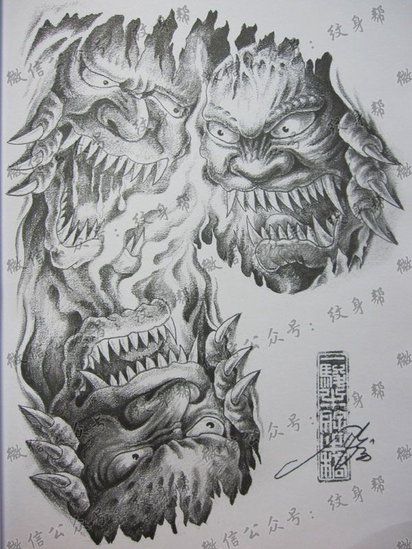 半甲唐狮手稿 传统的9款唐狮主题半甲纹身手稿图片